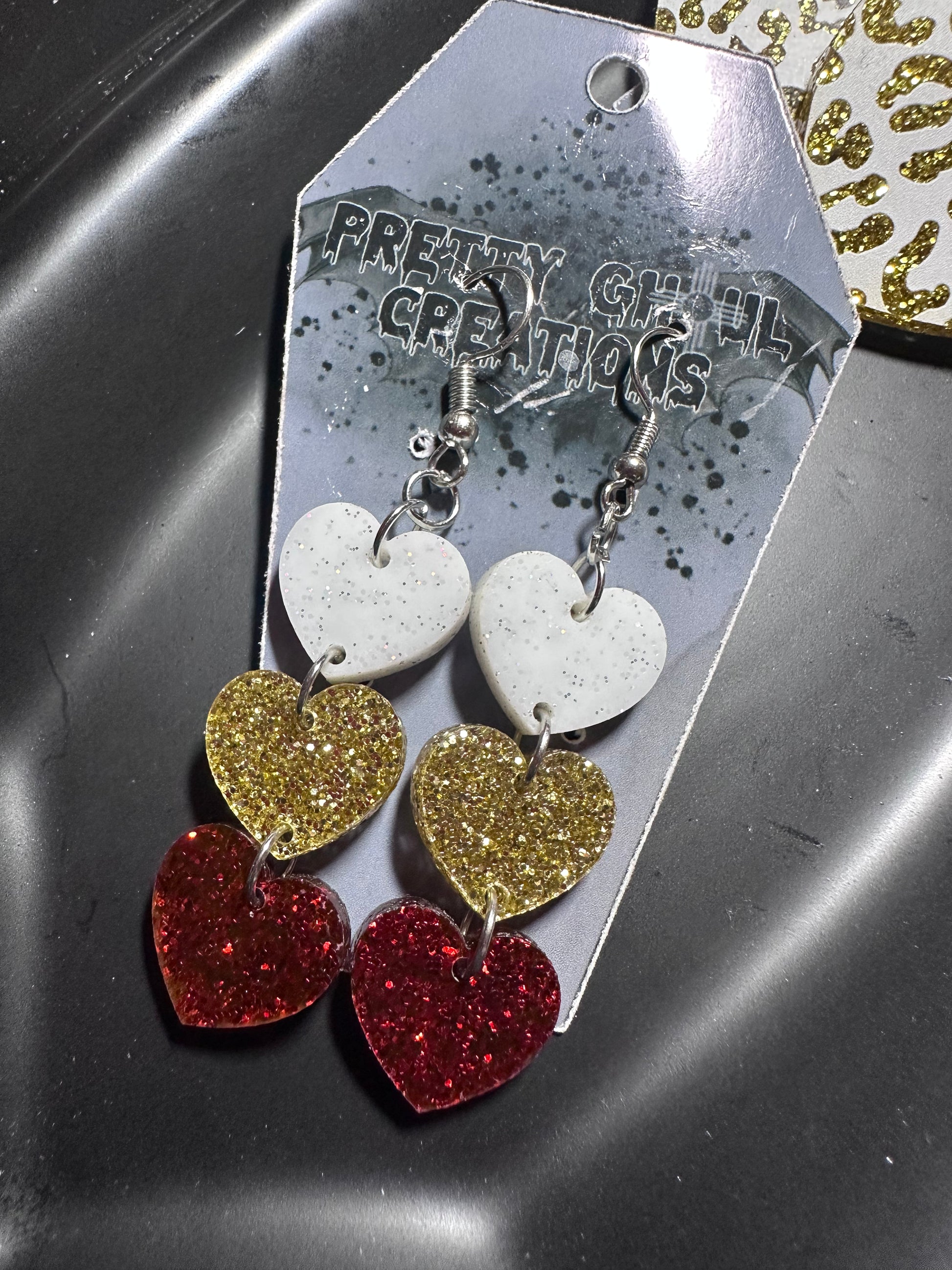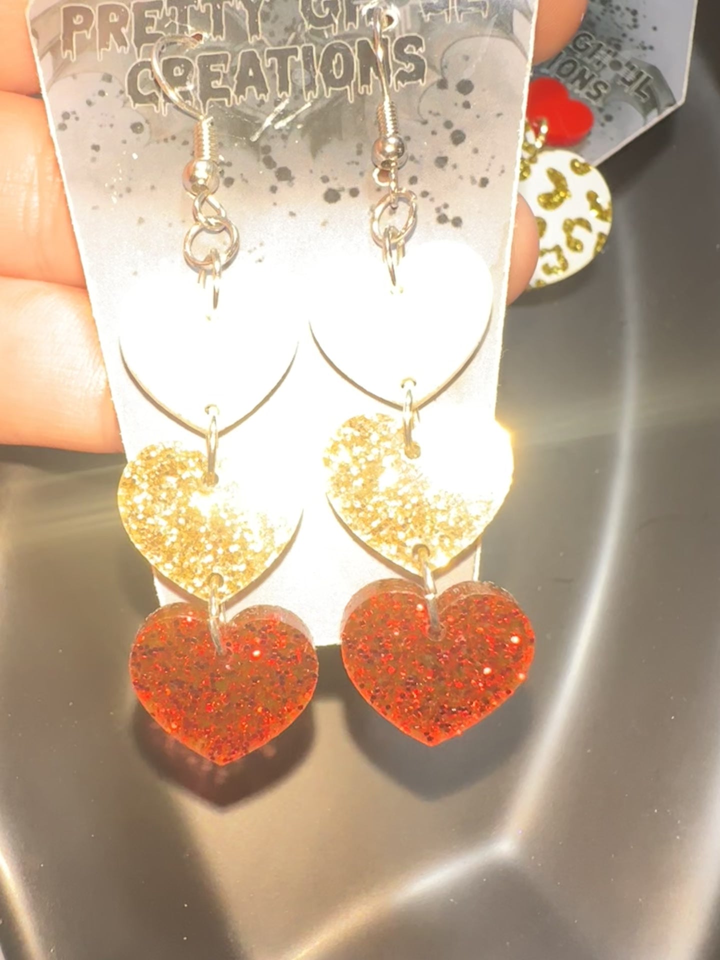 Add a touch of sparkle to your outfit with our Heart earrings! Handcrafted from glitter red, white, and gold acrylic, these earrings are guaranteed to make a statement. Perfect for special occasions or everyday wear, they are a must-have for any fashion-forward individual.